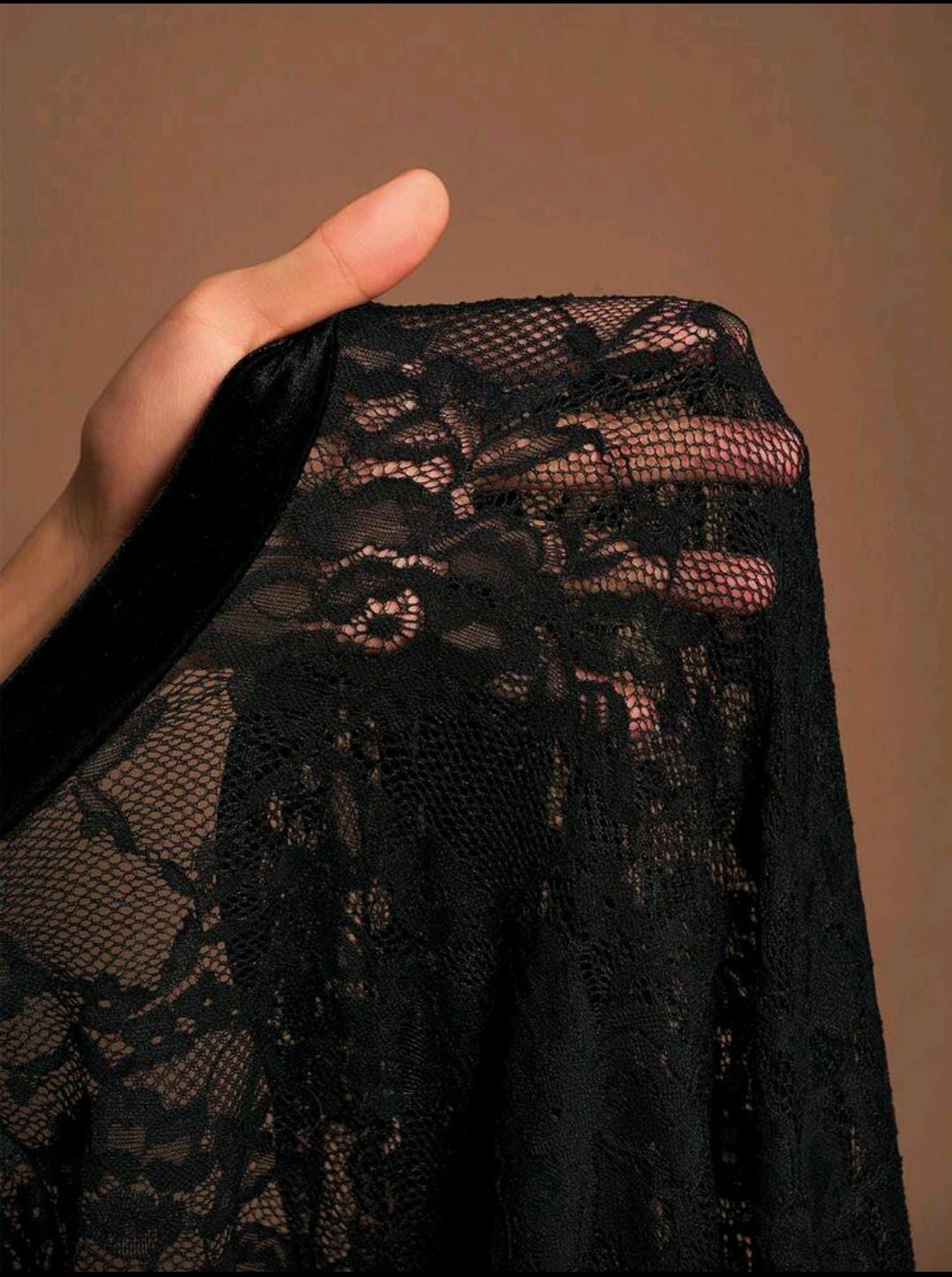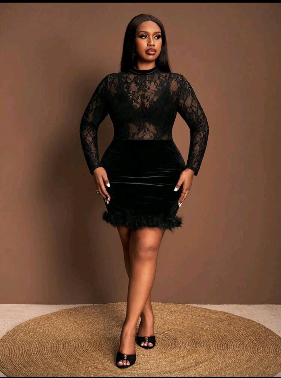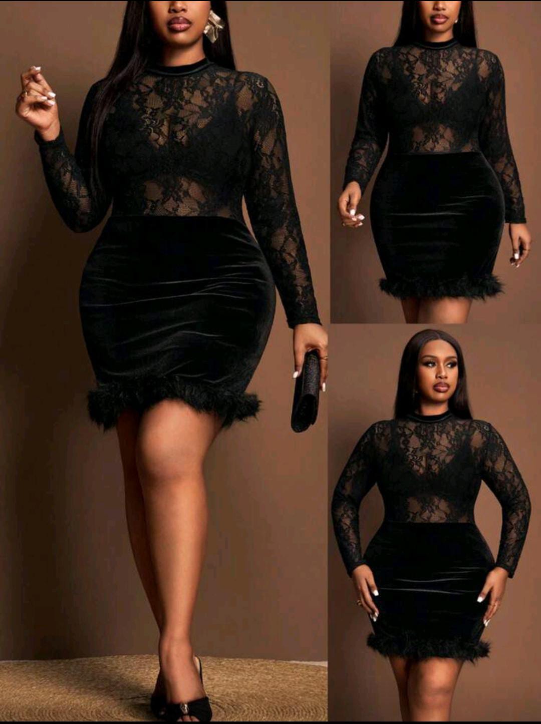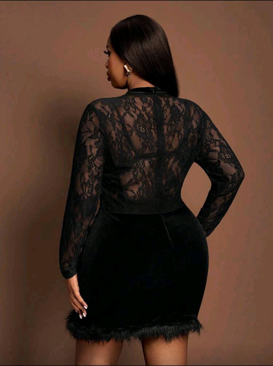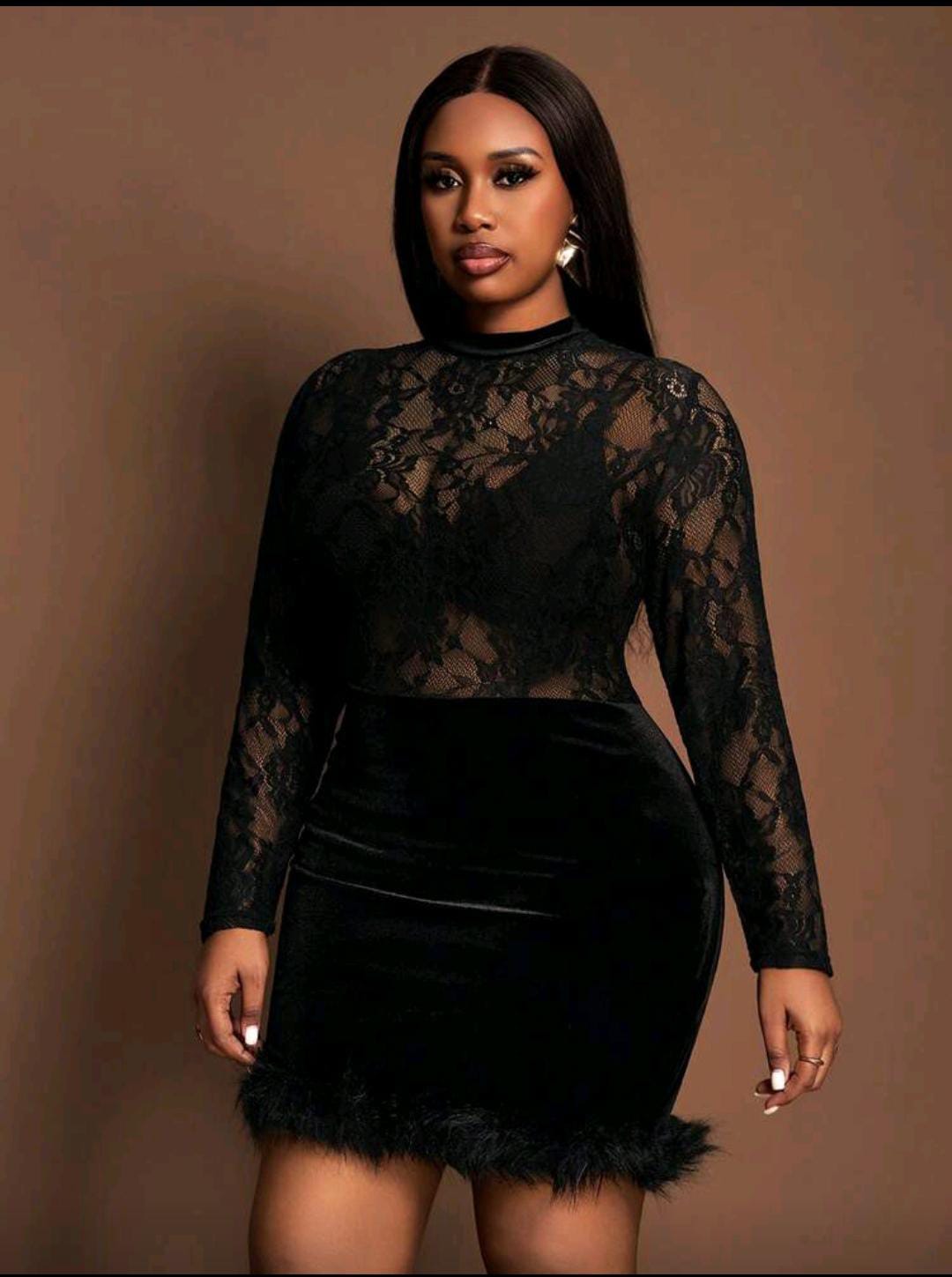 A chic black mini with a sheer lace long-sleeve top, velvet skirt, and feather-trim hem for that final touch of drama. Snug, flattering fit with a high neckline that keeps it elegant and bold at the same time.