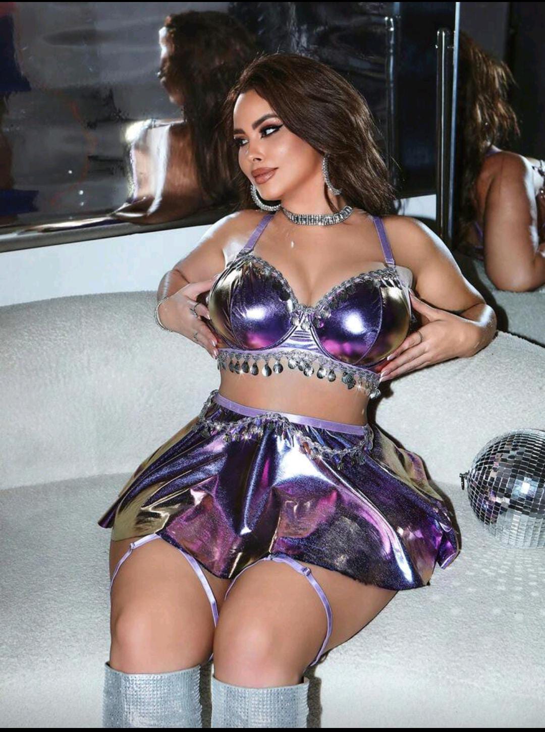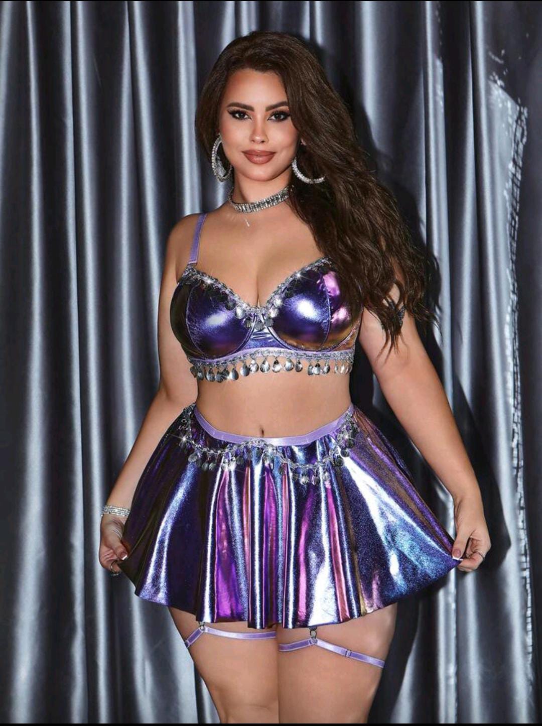 A glossy, light-catching set that turns every angle into a highlight. The structured top brings a confident shape, while the flirty mini skirt keeps it bold and fun. Perfect for party nights, themed looks, or “just because” moments. ✨ 🔥