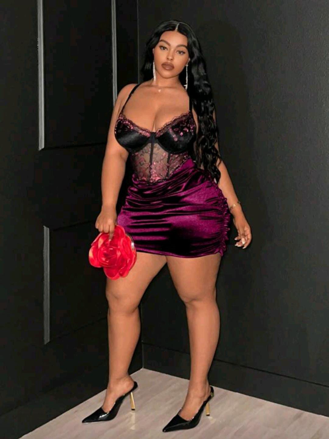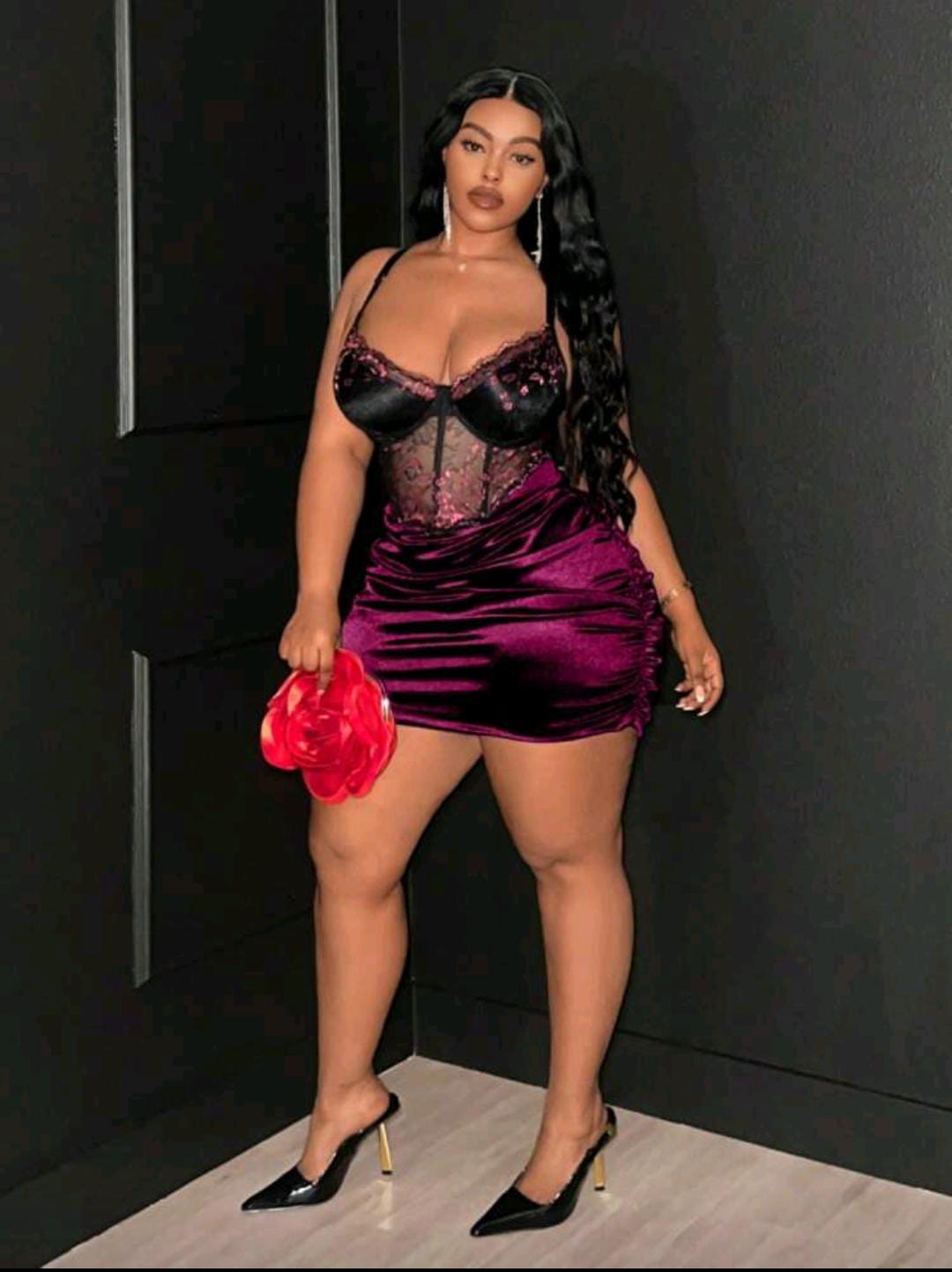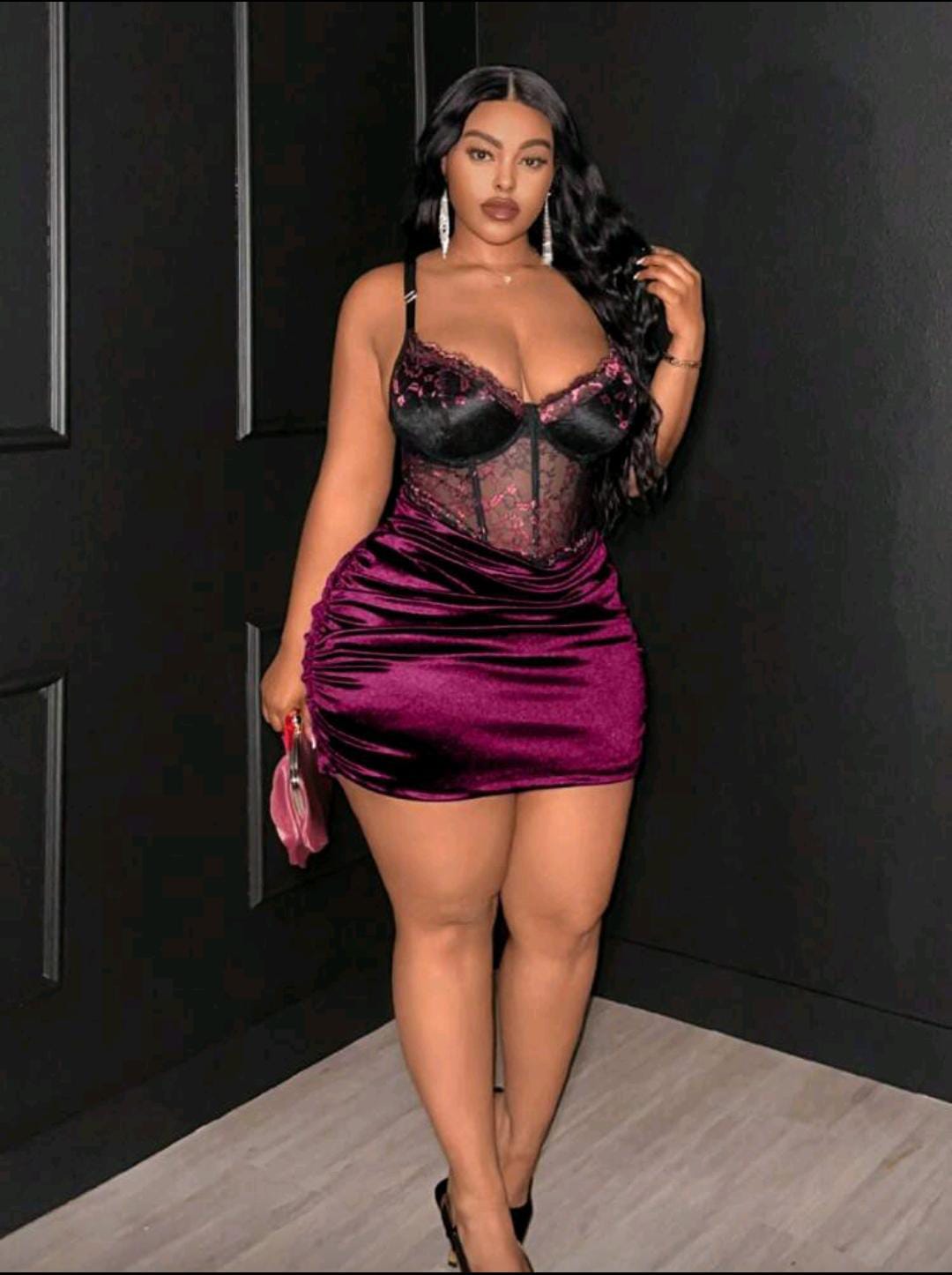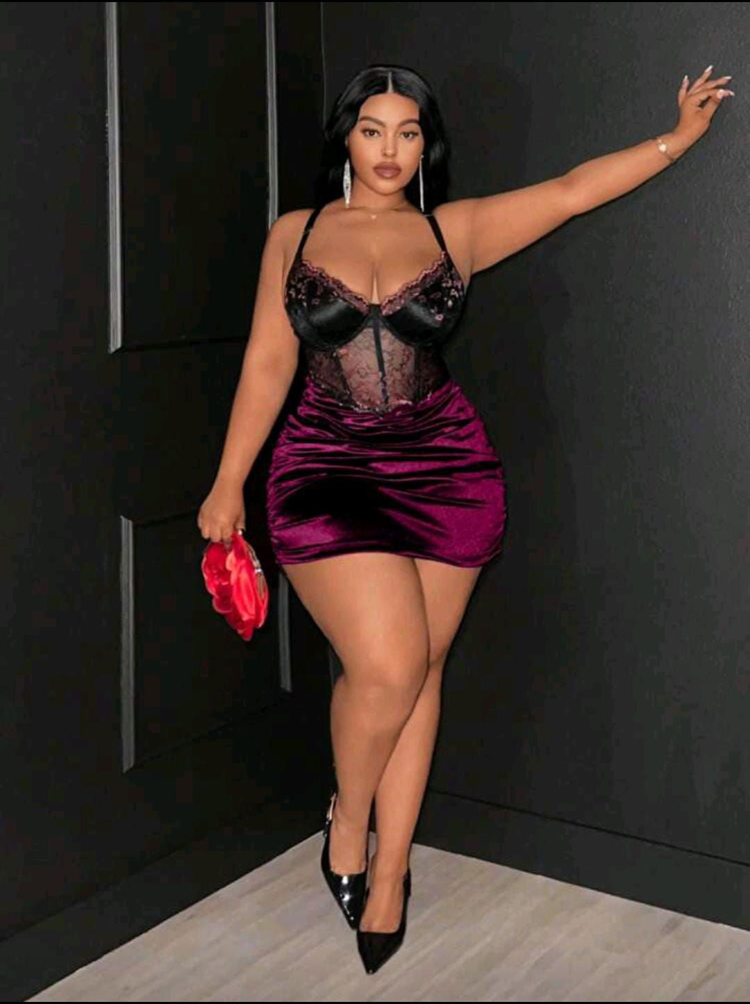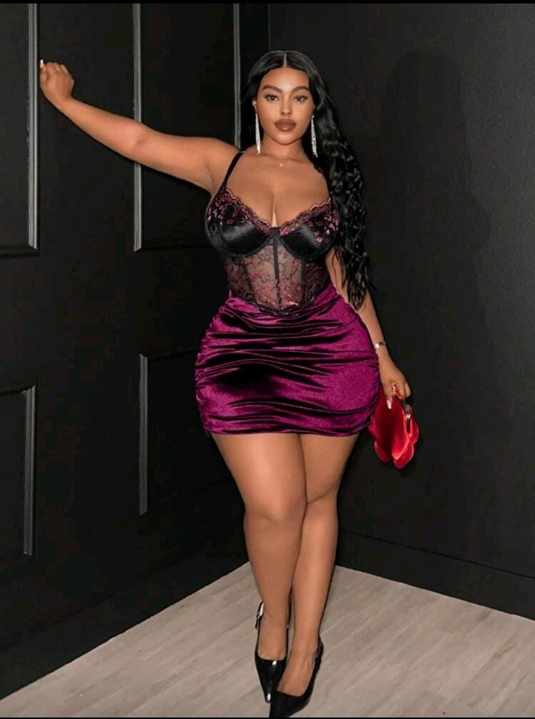 Glossy velvet in a deep plum tone with a lace-detail front that steals the spotlight. Smooth back, adjustable straps, and a mini fit that turns your mirror into a fan club.