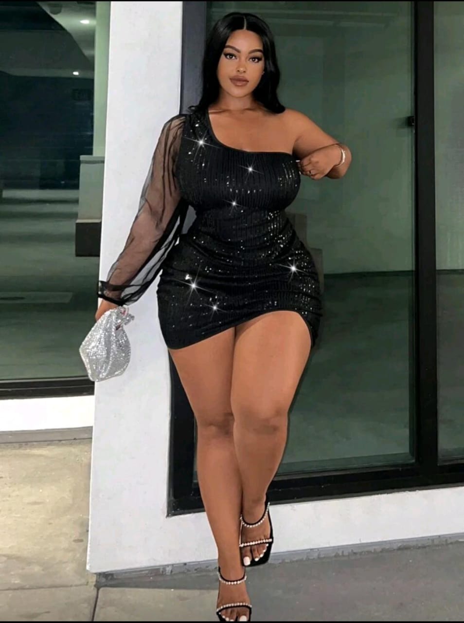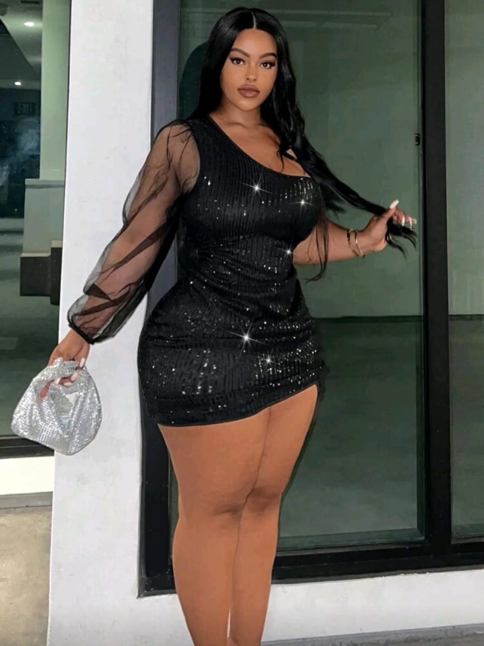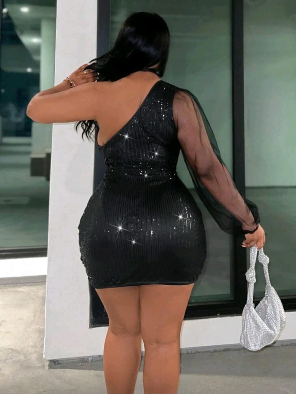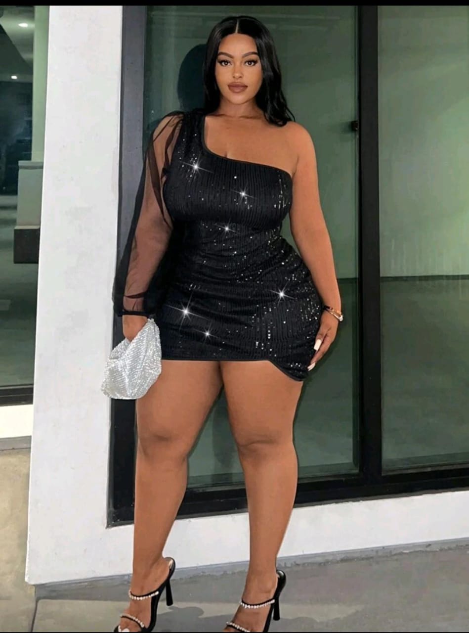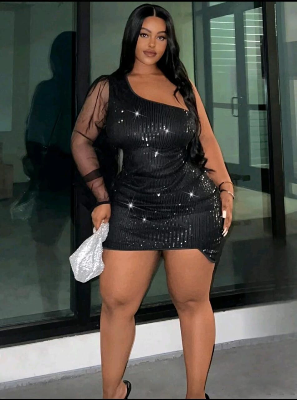 One-shoulder shimmer dress with sheer sleeve detail and a curve-hugging fit made to turn heads ✨
