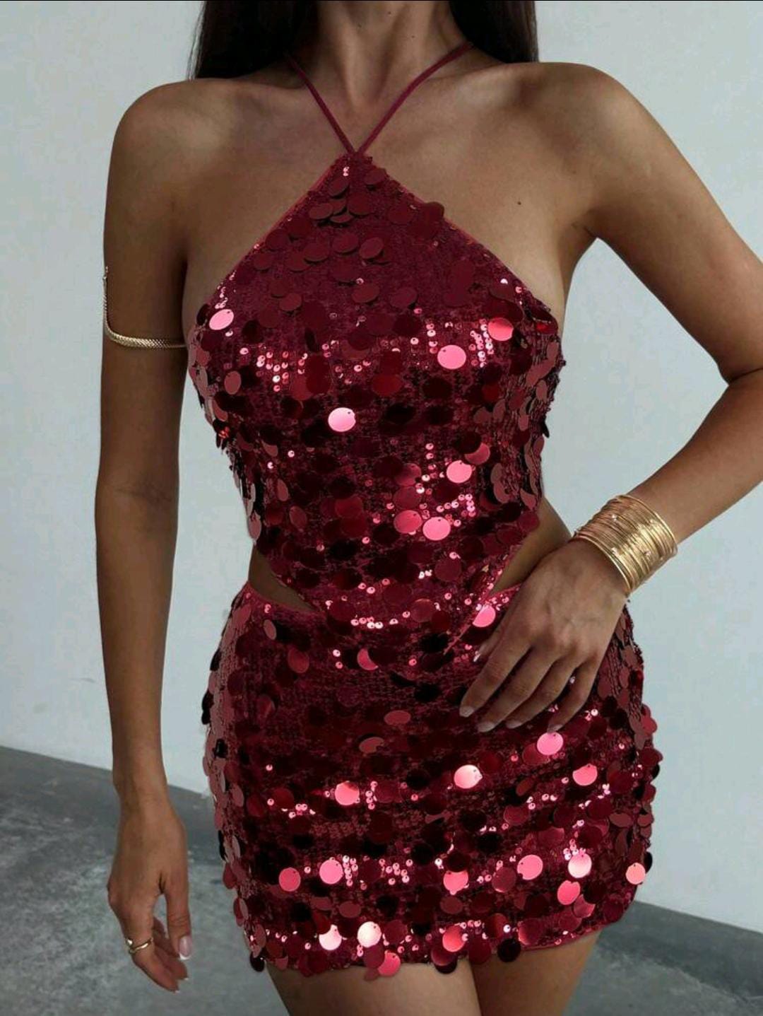 Disco-sequin halter top with a cute mini skirt, made for nights that turn into stories. 😌