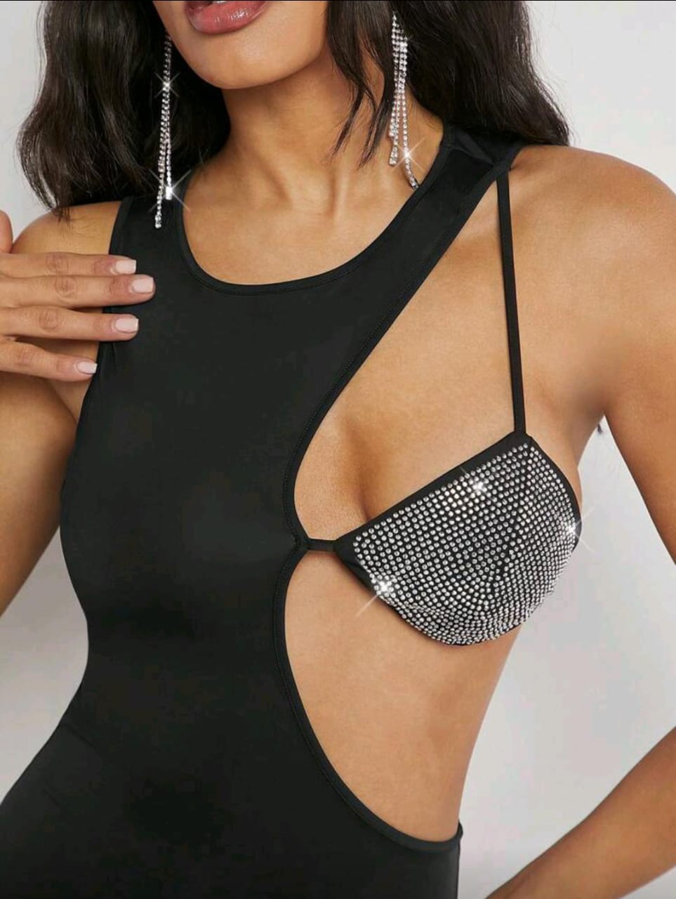 A bodycon mini that does the talking before you even say hi. Statement cutout, sparkle cup detail, and crystal straps that hit different under lights. Wear it when you want the room to remember you. ✨😈 ✨🖤