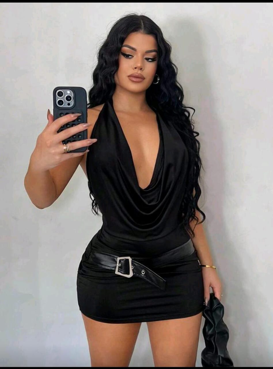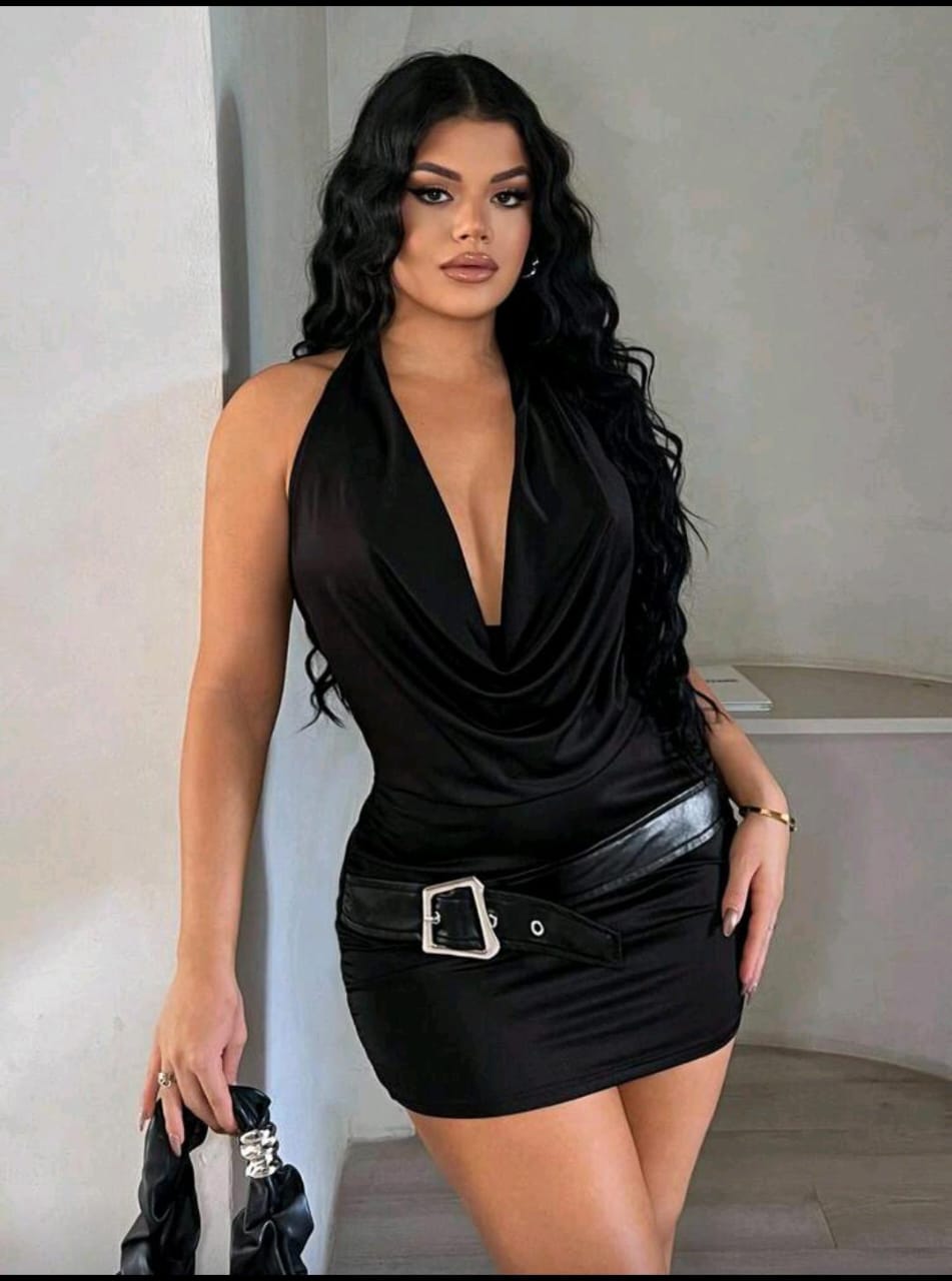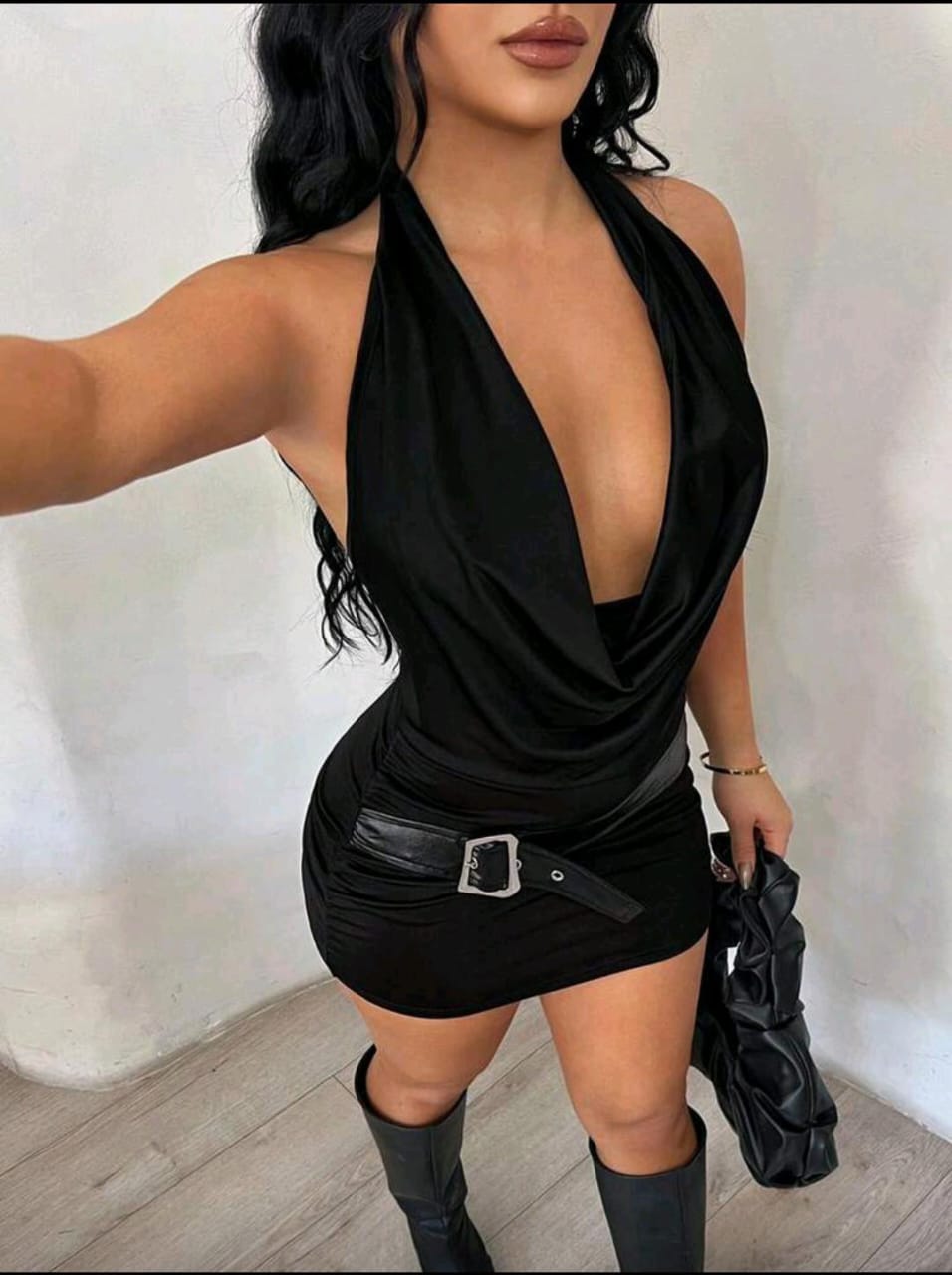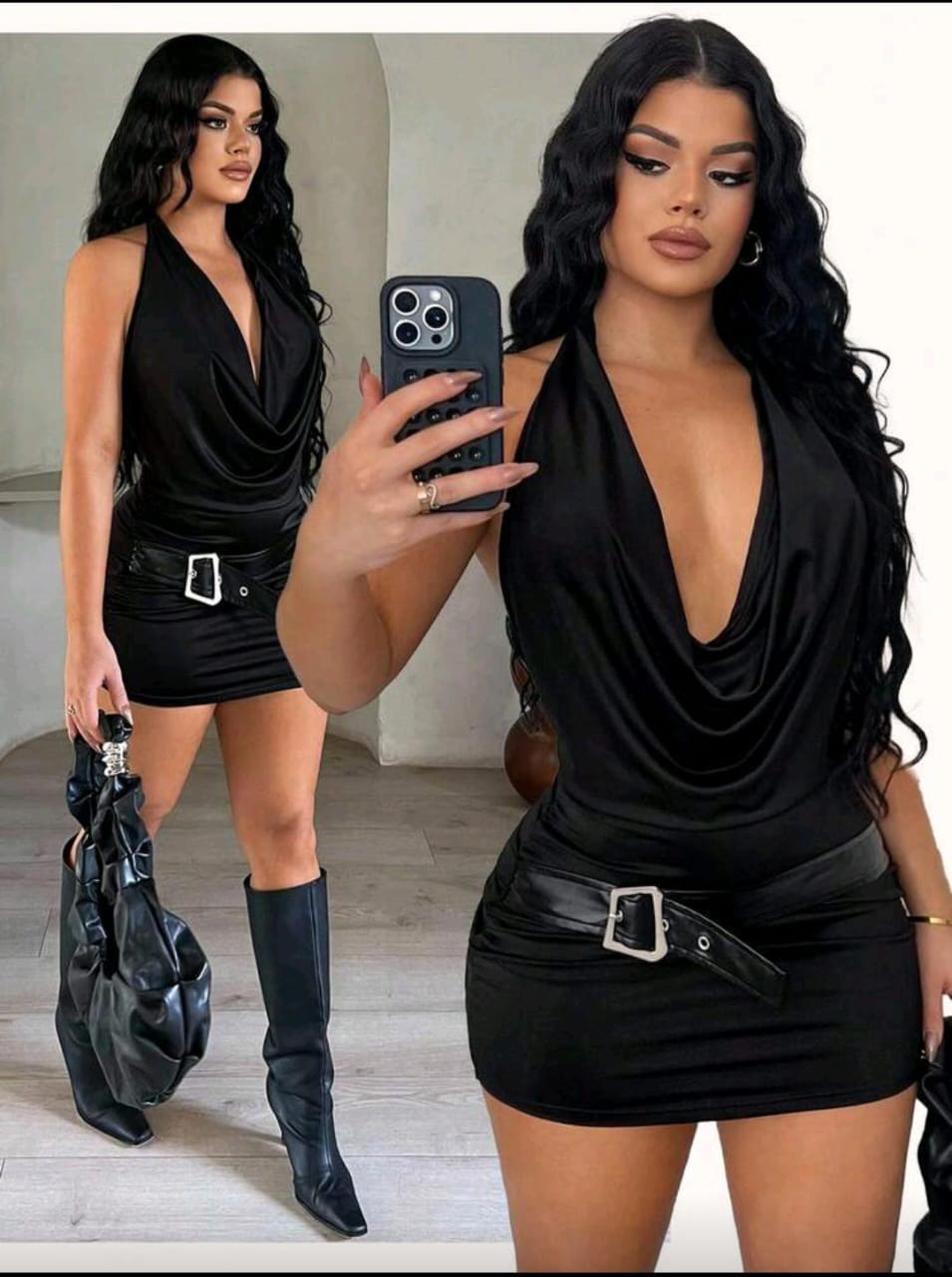 A sleek black halter mini with a draped neckline and a bold belt-detail that pulls the whole look together. Smooth, body-hugging fit for nights when you want the outfit to do the talking. Style it with boots or heels and watch plans magically appear. š¤āØ