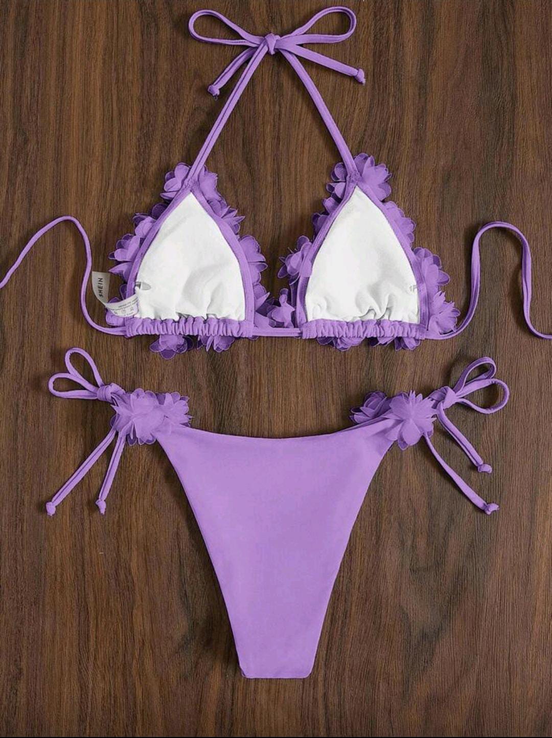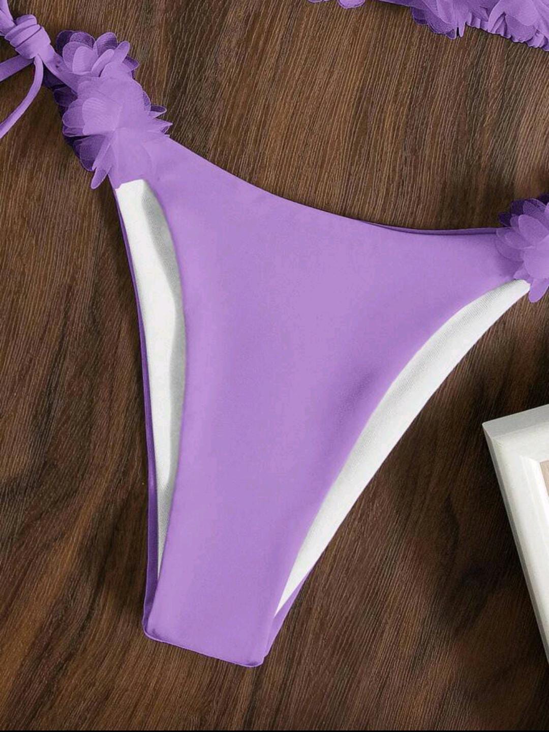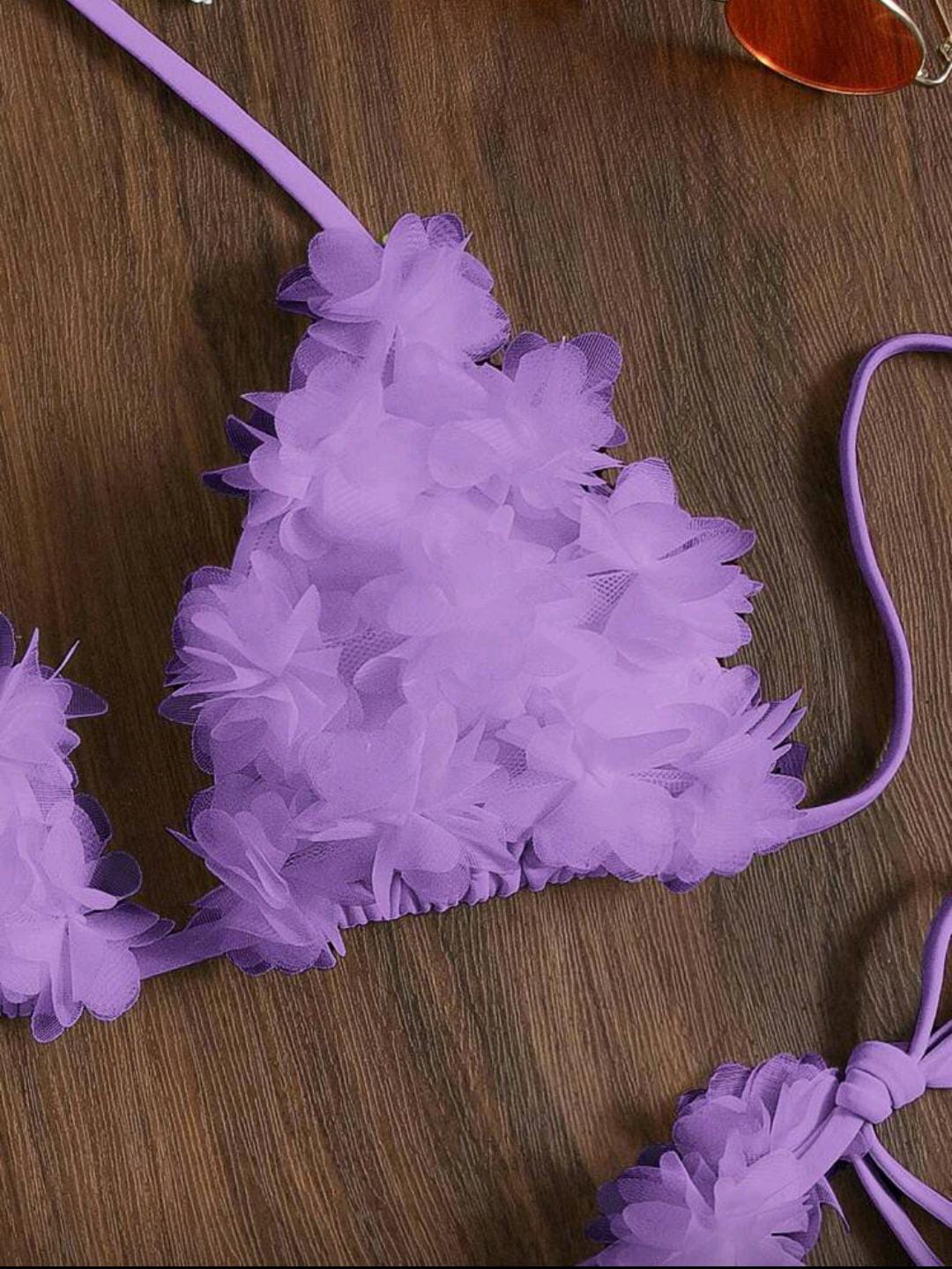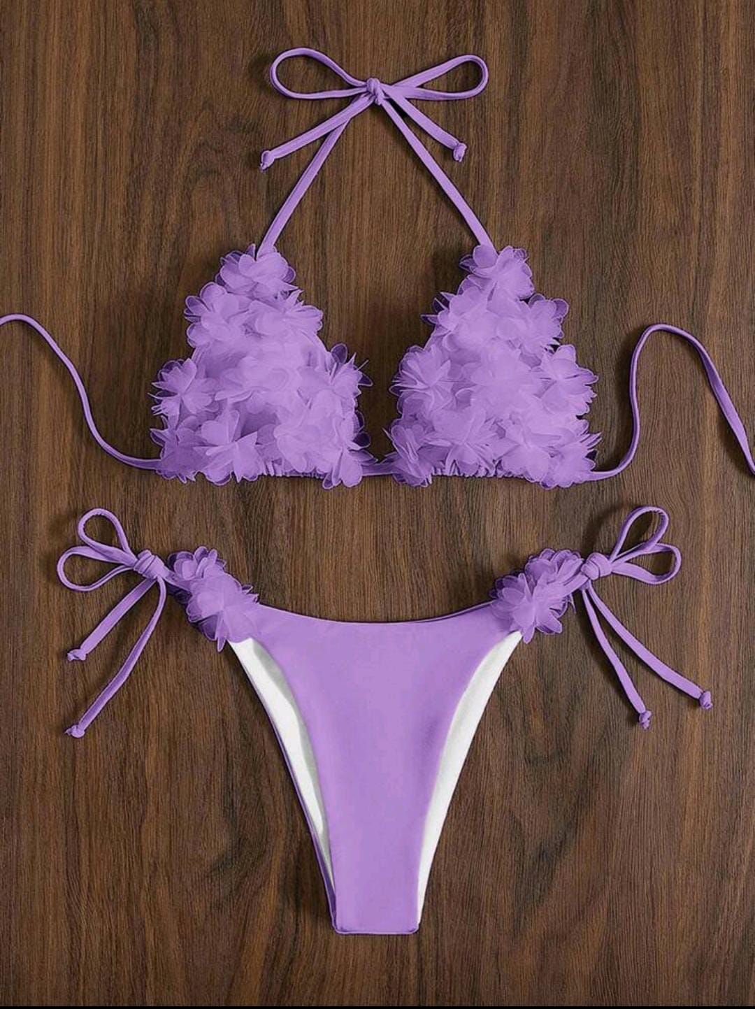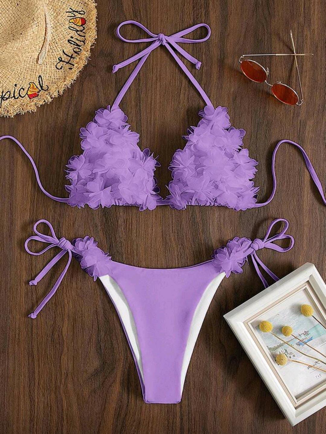 3D floral bikini with a halter top and tie-side bottoms for an adjustable fit. 🌸